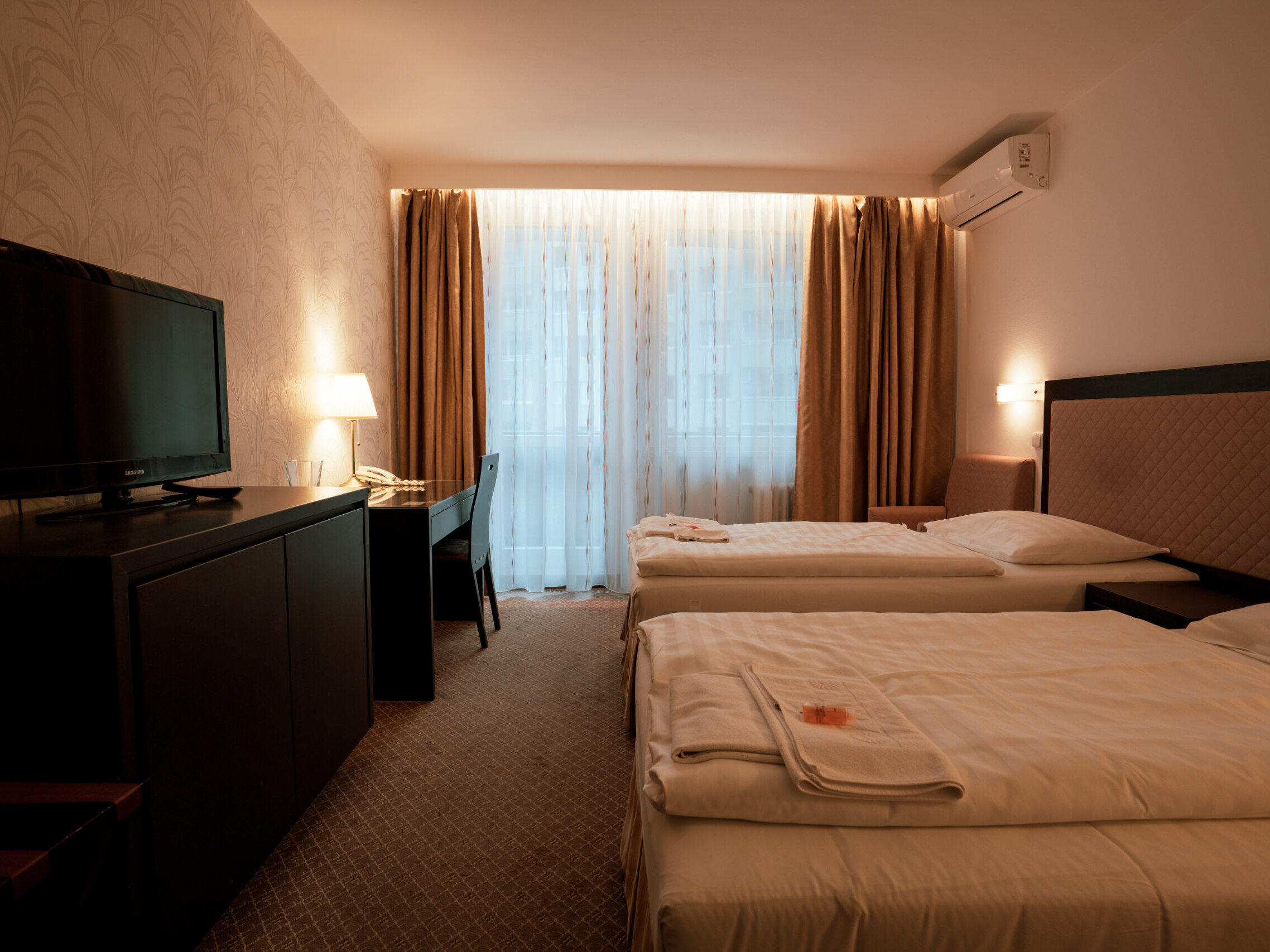 Izba je vybavená dvomi samostatnými posteľami, pracovným stolom, TV a Wi-Fi pripojením. Moderný interiér a príjemná atmosféra vytvárajú ideálne prostredie na oddych aj pracovné stretnutia. Samozrejmosťou je vlastná kúpeľňa so sprchovým kútom alebo vaňou.