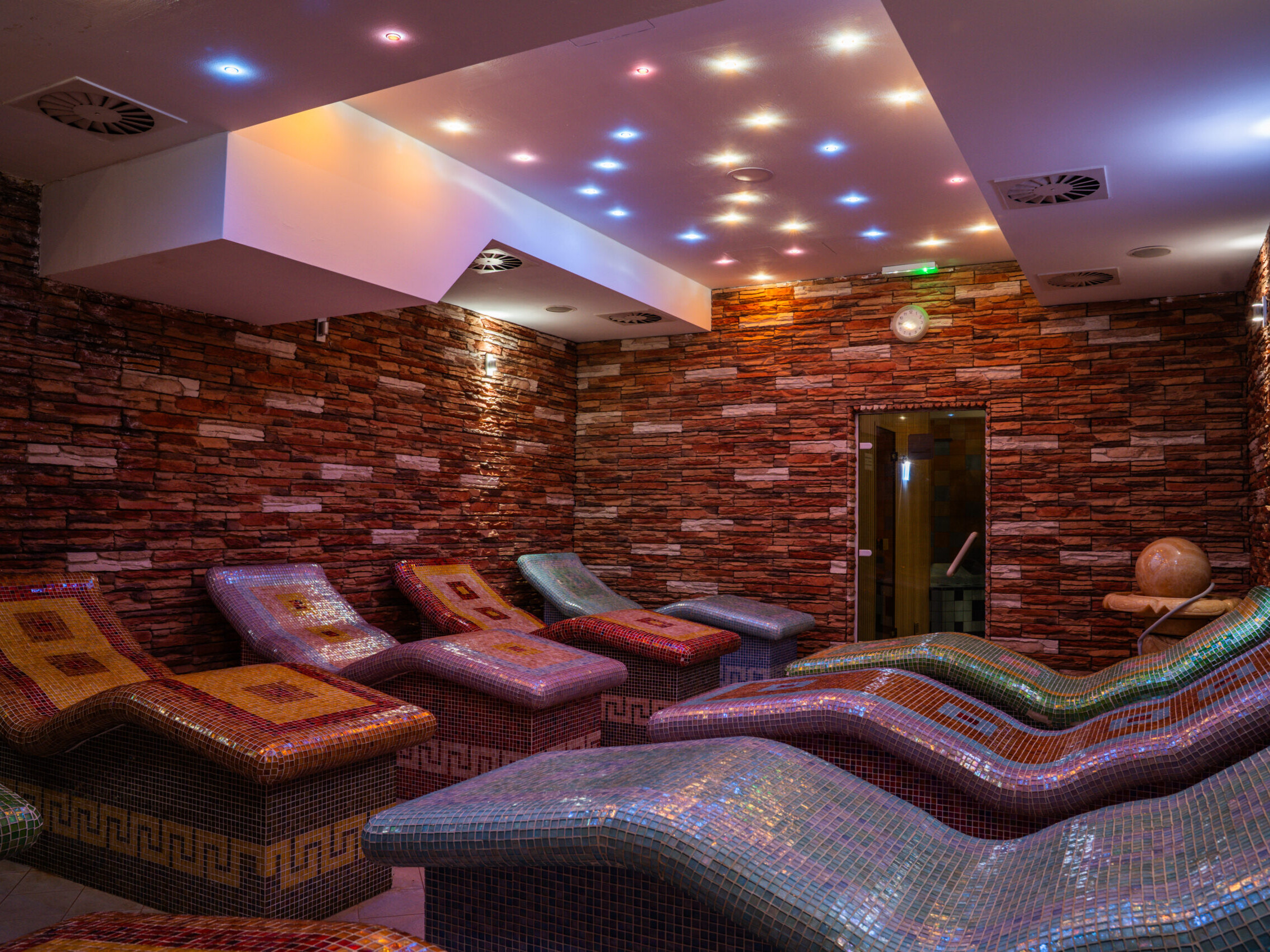Pokojné miesto určené na oddych po saunovaní či plávaní. Relaxačná zóna ponúka príjemnú atmosféru a priestor na spomalenie.